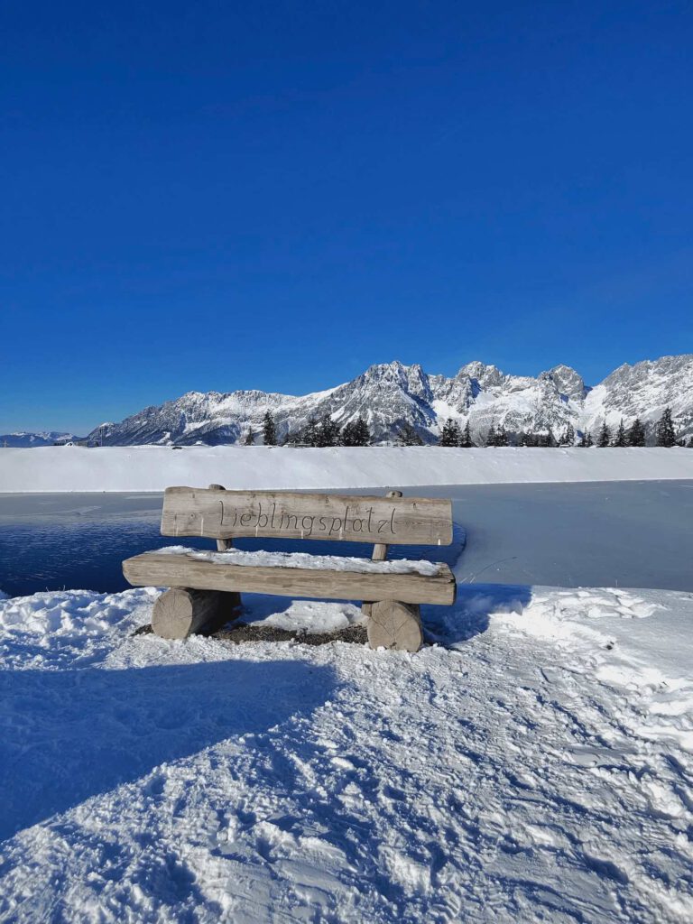 Der See selbst ist nicht groß – und genau das macht ihn so charmant. In wenigen Minuten lässt sich der Astbergsee einmal komplett umrunden, ganz gemütlich und ohne nennenswerte Steigung. Entlang des Weges stehen immer wieder Bänke, die förmlich dazu einladen, stehen zu bleiben, zu schauen, durchzuatmen. Ich liebe es, einfach Platz zu nehmen und die Spiegelung des Kaisergebirges im Wasser zu beobachten.