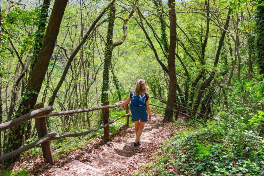 Der Verlauf des Weinlehrpfad Kurtatsch nimmt mit dem letzten Teil nochmal einen andren Verlauf und zeigt nun weniger Aussicht auf die Landschaft. Wir gewinnen nun mehr Einblicke in den kleinen Waldabschnitt, sowie einem weiteren Wasserfall. Die Temperaturen sinken leicht, als wir die Treppen runtergehen. Schließlich überrascht uns eine relativ neu gebaute Holzbrücke.