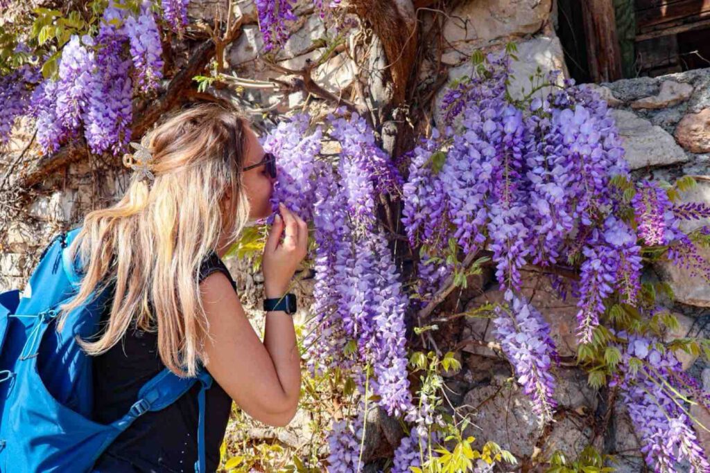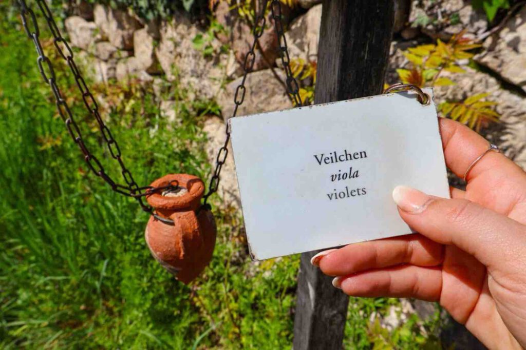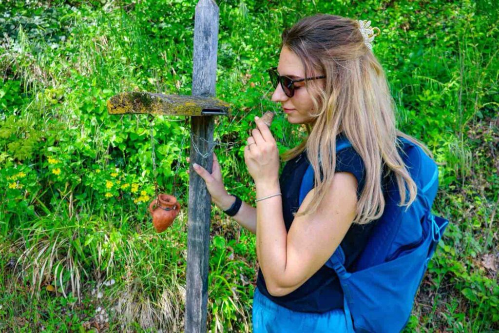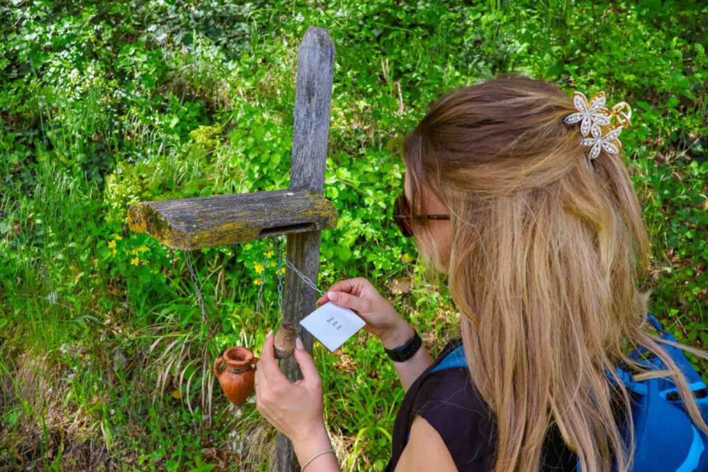 Dann erblicken wir einen kleinen hölzernen Ständer mit einem kleinen verschlossenen Tongefäß. Ich hatte im Wanderführer schon gelesen, dass es hier wohl eine Art Duftprobe zu Wein geben wird, konnte mir aber vorher nichts darunter vorstellen. Tatsächlich ist es so, dass ihr das Tongefäß mit dem Korken öffnet und eine Nase ran haltet und versucht zu erraten, was ihr da riecht. Es ist wirklich ein großer Spaß. Manche Düfte waren für mich eindeutig und bei anderen Düften, wäre ich nicht darauf gekommen.
