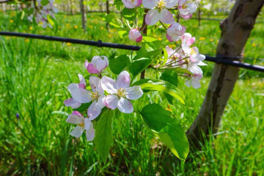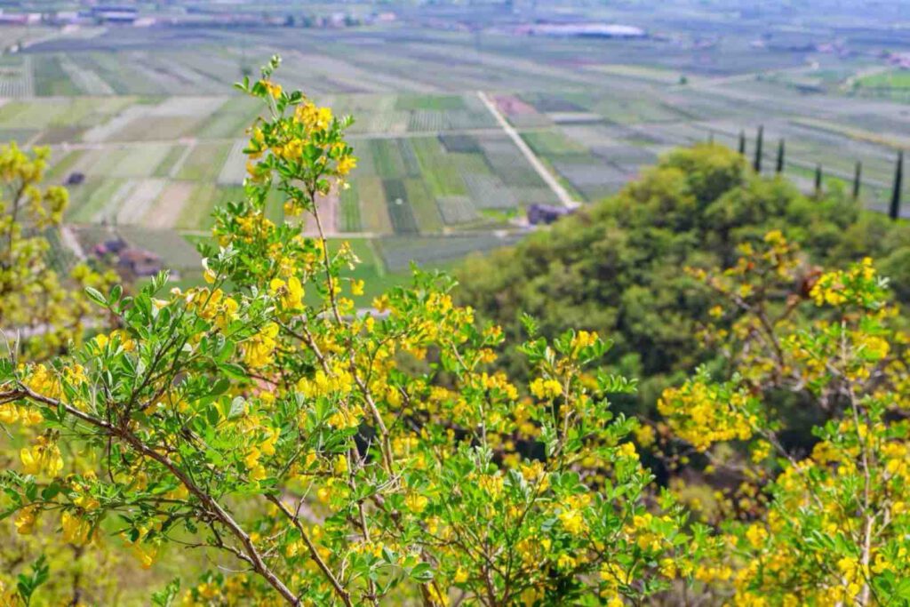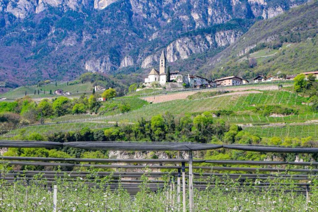 Kommen wir nun zu dem Punkt, den wir euch am Anfang dieses Beitrages schon angeteasert haben. Für Anfang April, war es ein sehr heißer Tag und wir hatten schon 26 Grad und die Sonne schien uns die ganze Zeit auf die Köpfe. Wir wussten, dass nicht weit entfernt von uns, der Kalterer See ist und sehnten uns nach Abkühlung. Wie ihr etwas herauslesen könnt, die Wanderung ist wirklich sehr warm, weil sie fast durchgehend durch die Sonne geht. Es gibt kaum schattige Plätze und Weinberge sind so ausgelegt, dass sie immer etwas wärmer und windstiller sind. Ich empfehle euch also, euch darauf einzustellen… Sonnencreme, Kopfbedeckung, ausreichend zu trinken solltet ihr auch einplanen. Wir hatten es also etwas eilig, an den Kalterer See zu kommen und haben uns deswegen nach einer Abkürzung umgesehen. Normalerweise müsstet ihr die Route laut dem Wanderführer nach links verlassen und würdet dann den Rückweg durch Obstplantagen gehen. Besonders schön im April: die Apfelbütte ist in Südtirol angekommen. Unterhalb der Wanderung befinden sich zahlreiche Apfelfelder und ihr hättet einen tollen Blick darauf.