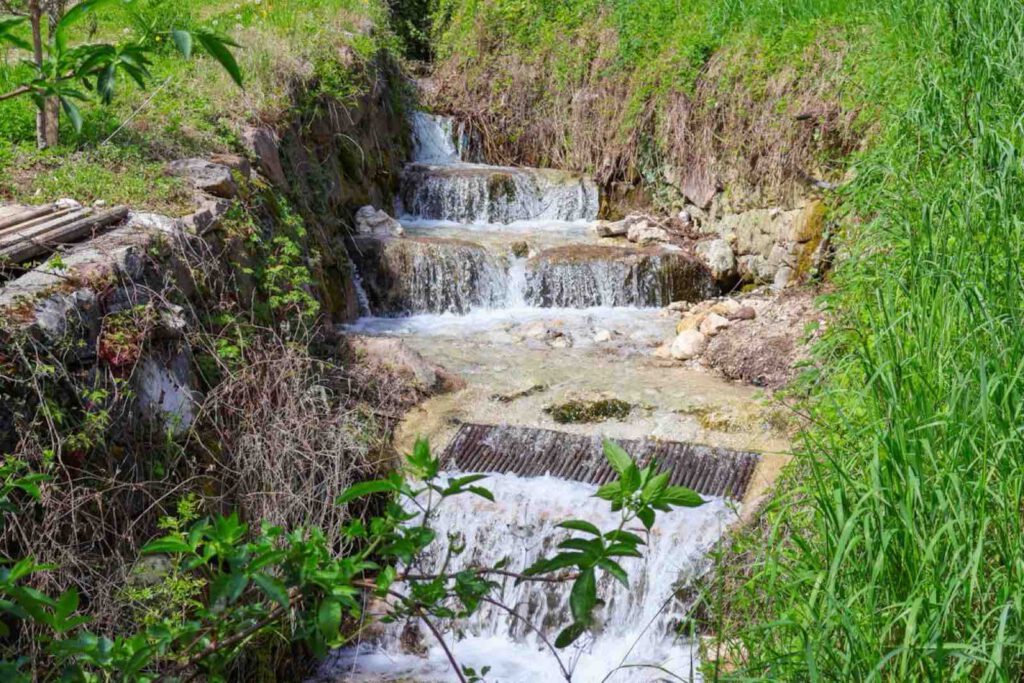 Dann hören wir auf einmal Wasserplätschern – ist das ein Wasserfall? Tatsächlich stoßen wir wenige Meter weiter auf einen Wasserfall, der mitten durch den Weinberg springt. Wunderbar erfrischend und er steht sogar unter Denkmalschutz: