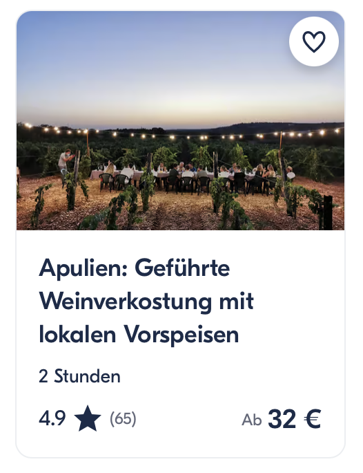 Das Erlebnis kannst du dir hier* nochmal direkt ansehen und buchen: Apulien: Geführte Weinverkostung mit lokalen Vorspeisen*